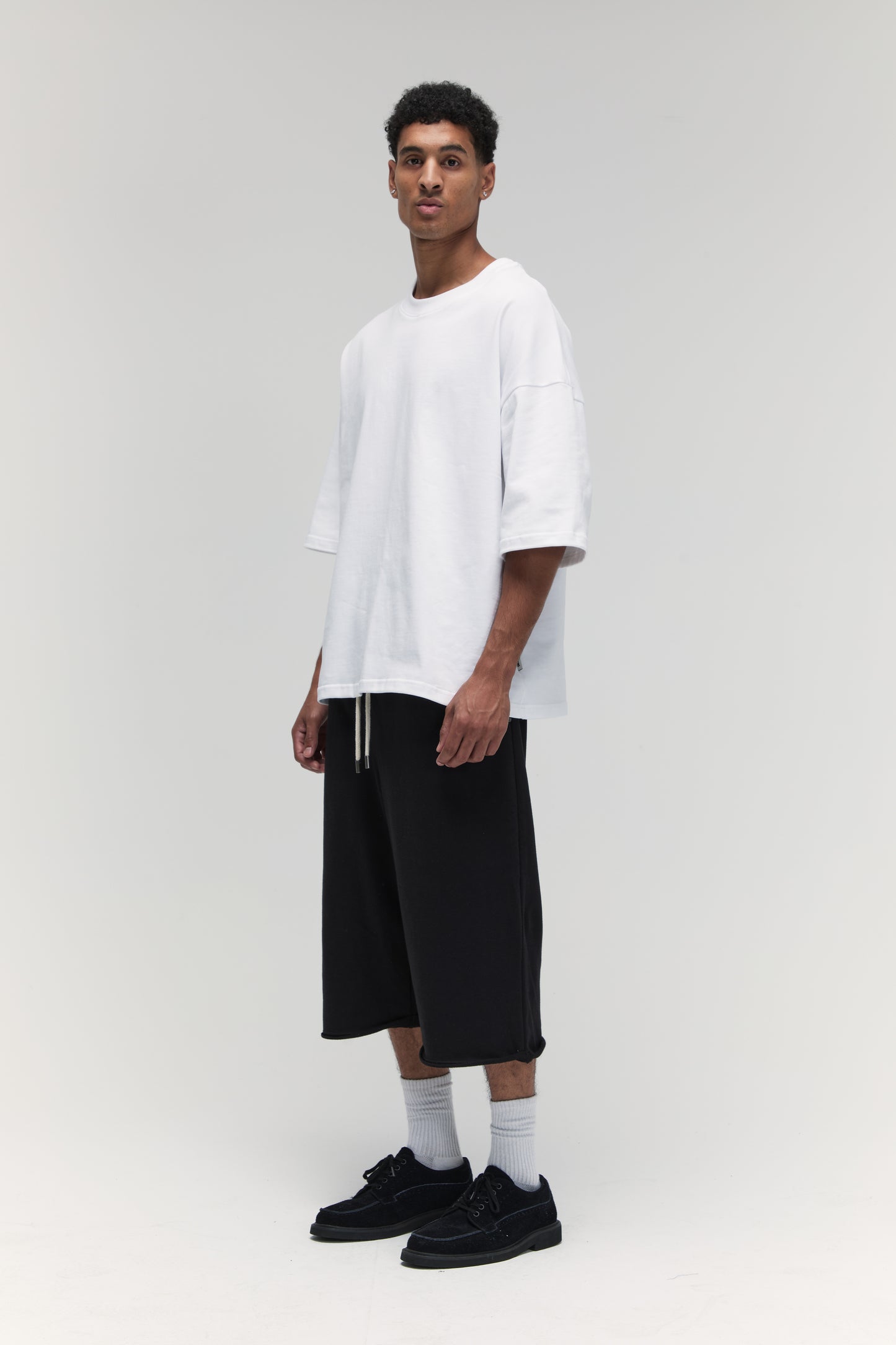 The terry shorts are made from 365gsm unbrushed French terry, offering a structured feel with natural comfort. Cut to fall just above the shin, with an elasticated waistband, raw edge hems, and drawstrings finished with branded metal aglets. Subtle detailing includes circular ‘P’ rivets and a back patch pocket. Made in South Africa.